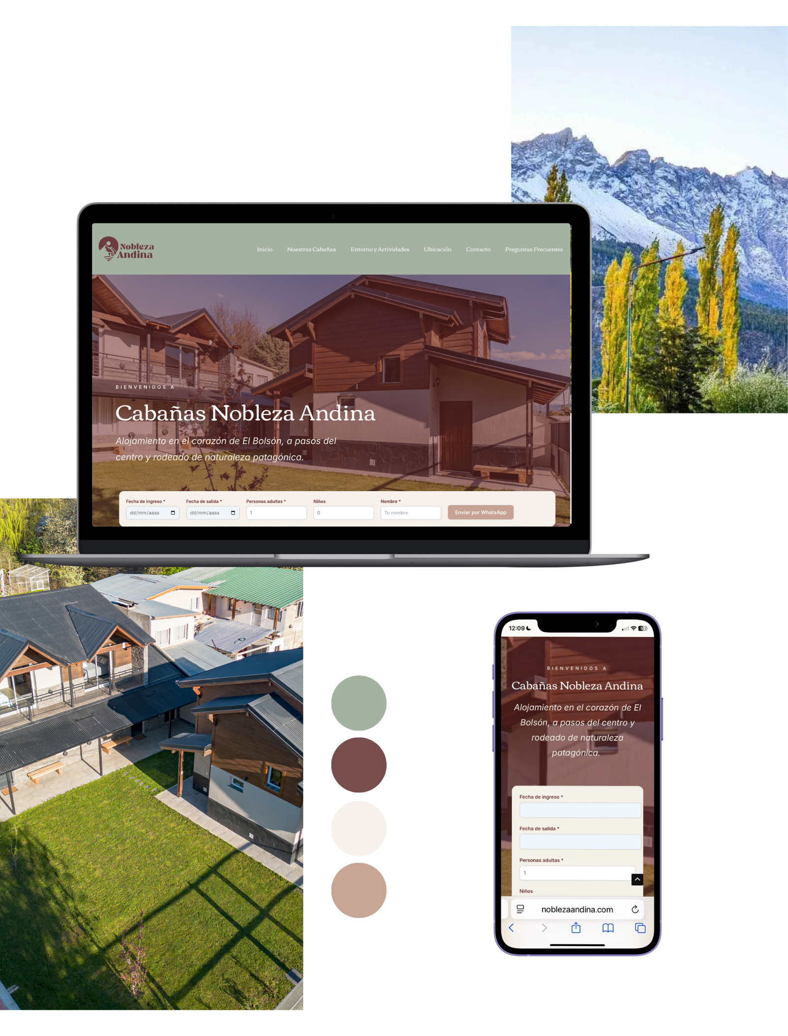 Sitio web diseñado para invitar al visitante a conocer sus cabañas, vistas, jardines, servicios y actividades de la zona.   Incluye mapa interactivo, contacto directo, links a Booking y Airbnb, galería visual y formulario integrado.
